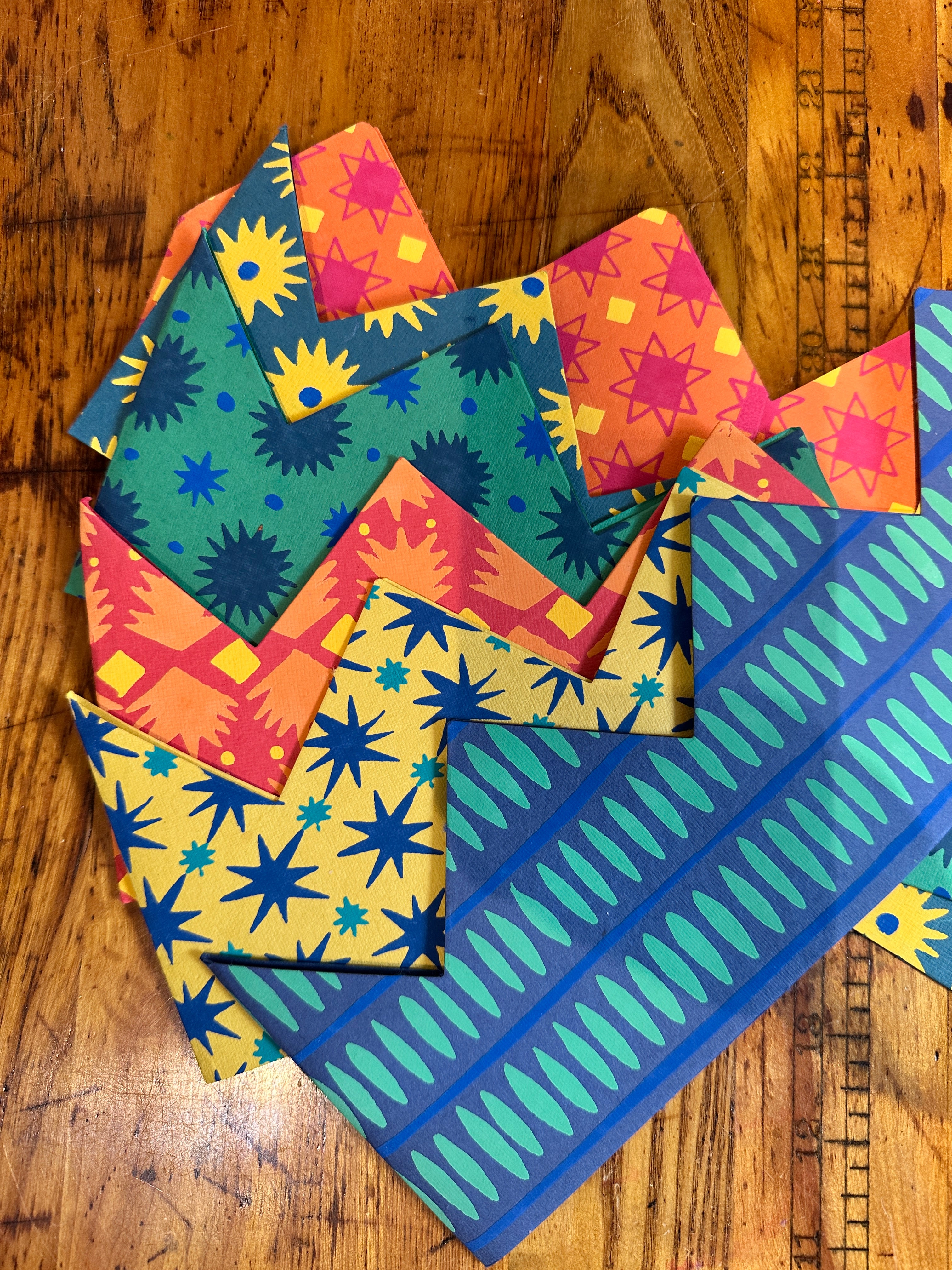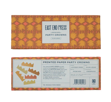 A set of 6 colorful party crowns are each screen printed by hand with a different pattern onto recycled paper. Each crown is slightly different. They are sturdy enough to be packed away and reused celebration after celebration. The crowns are large enough for adult heads, and perfect for adding some fun to your party! Availble in single colorways or "celebration". which is an assortment of bright colors.