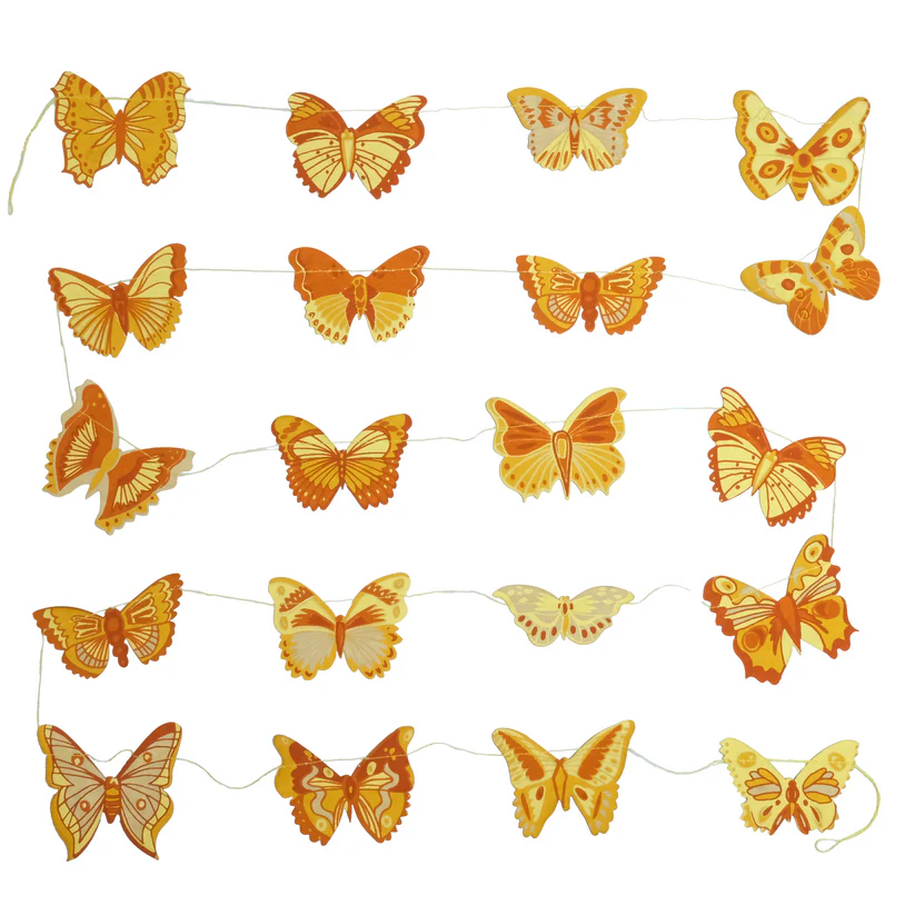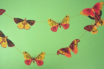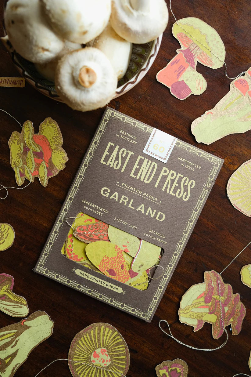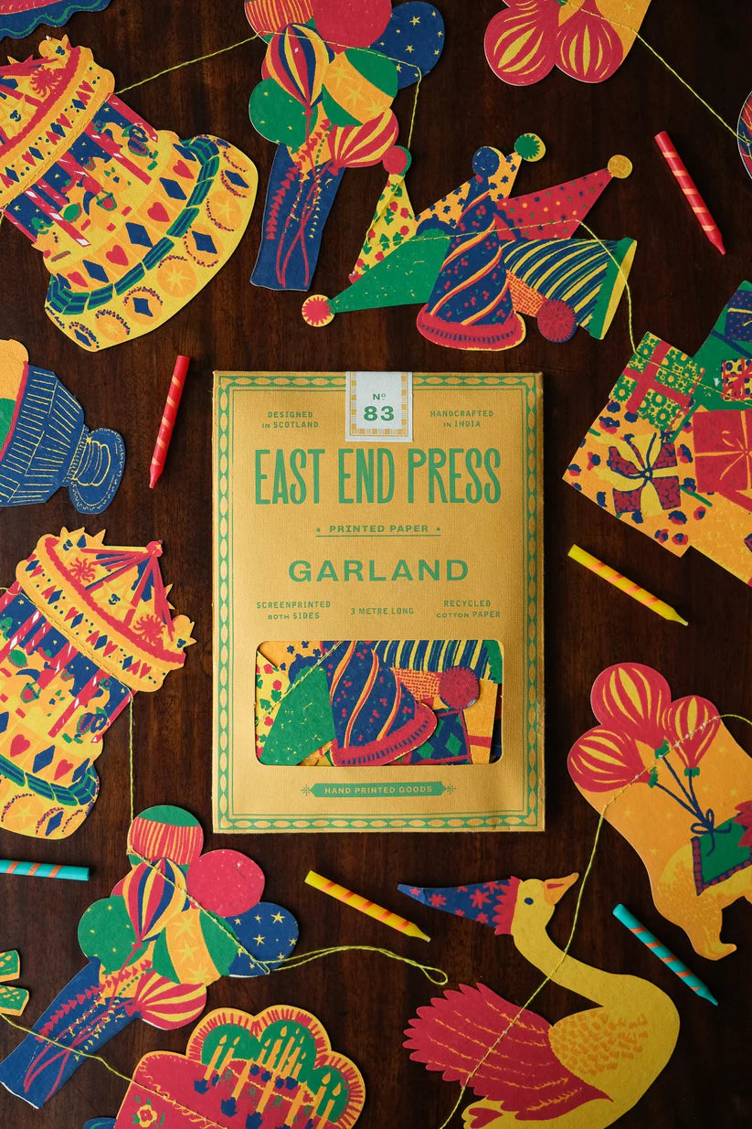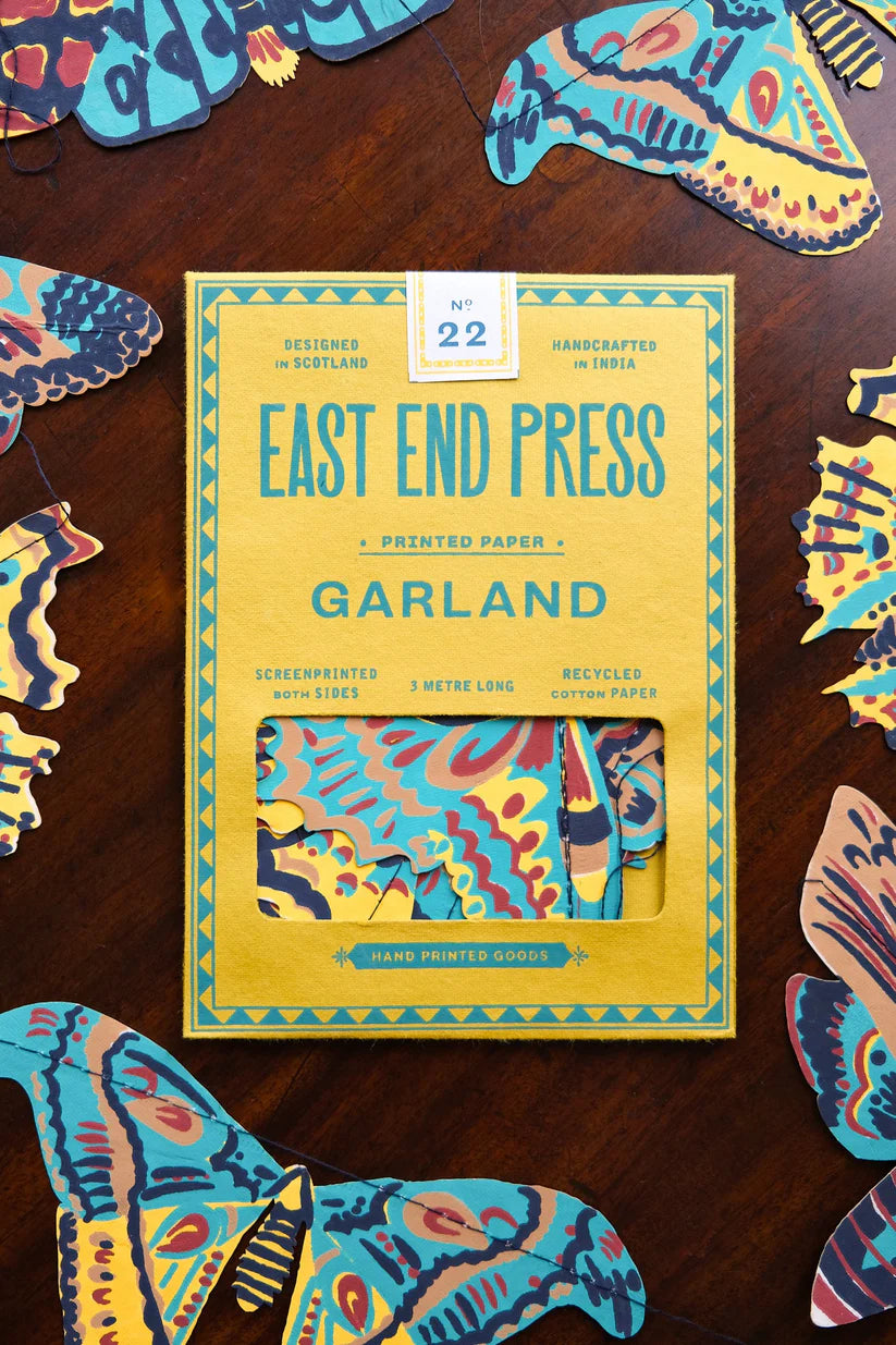 Yes we realize these are not made in North America.....but when Heidi saw these, she made a new category at the shop -- "exceptional exceptions"! Because she just HAD to have them in the shop! Stunning recycled paper garlands, designed in Scotland and screenprinted by hand on both sides by talented artisans in Jaipur, India. By East End Press. 3 meters long.