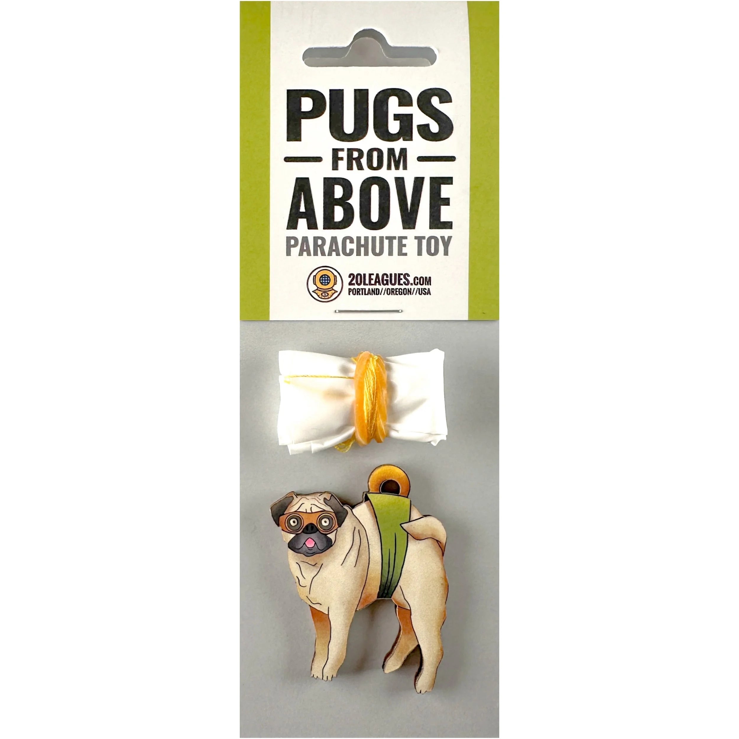 Photo props, cubicle art, WFH friends, or just to add a little character, these approx 2" wood and paper action figures from 20 Leagues add zhoosh to the everyday. Parachutes are made from recyclable plastic. (Pugs is 1.5")